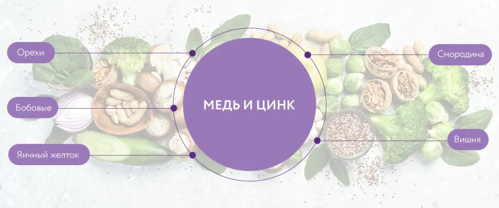 Ořechy, vaječné žloutky a luštěniny jsou bohaté na měď. Zinek – luštěniny, rybíz, třešně.