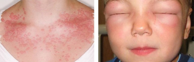 Pokud studujete dětské fotografie s alergickou reakcí, můžete pochopit, že reakce se projevuje červenými skvrnami na obličeji – drsnými a velkými, malou červenou vyrážkou podobnou kopřivce atd.